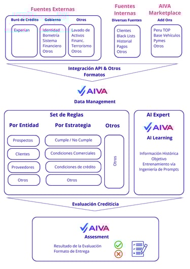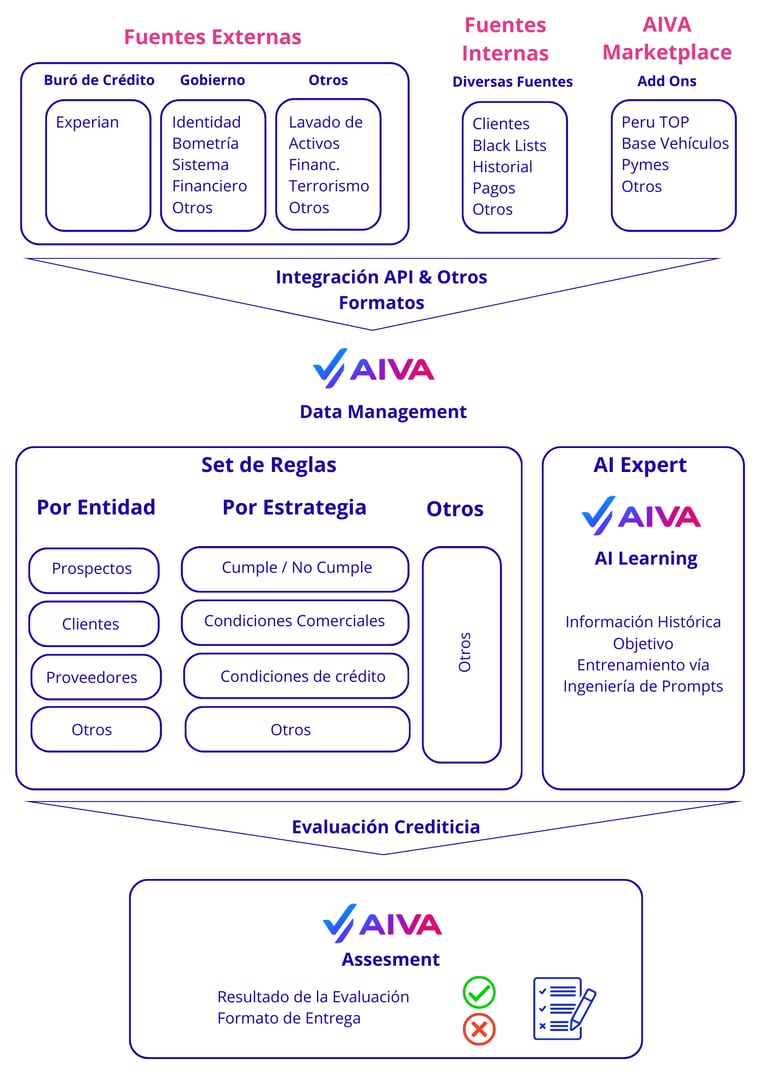 Integra tus fuentes de datos a AIVA, crea reglas de decisión ilimitados y en minutos para evaluar a tus prospectos, clientes o proveedores.