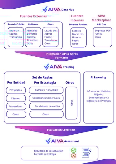 Integra tus fuentes de datos a AIVA, edita reglas de decisión ilimitados y en minutos, evalúa a prospectos, clientes o proveedores de manera automatizada con tus propias políticas.